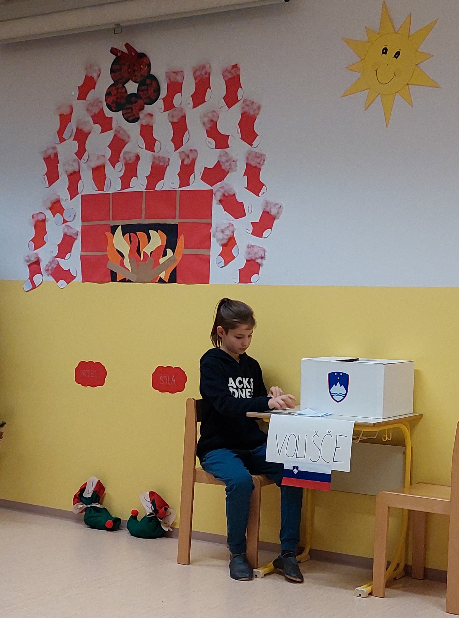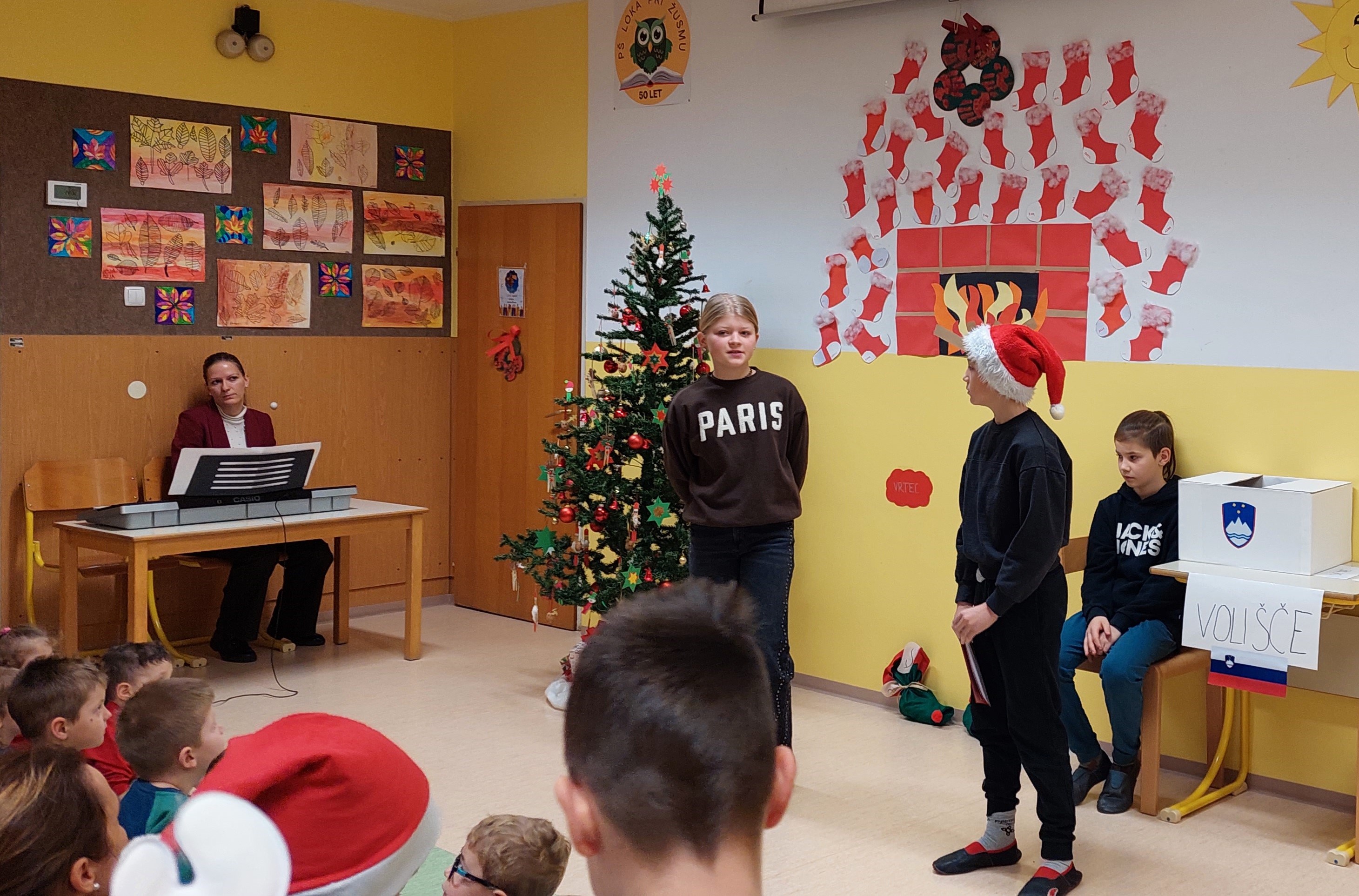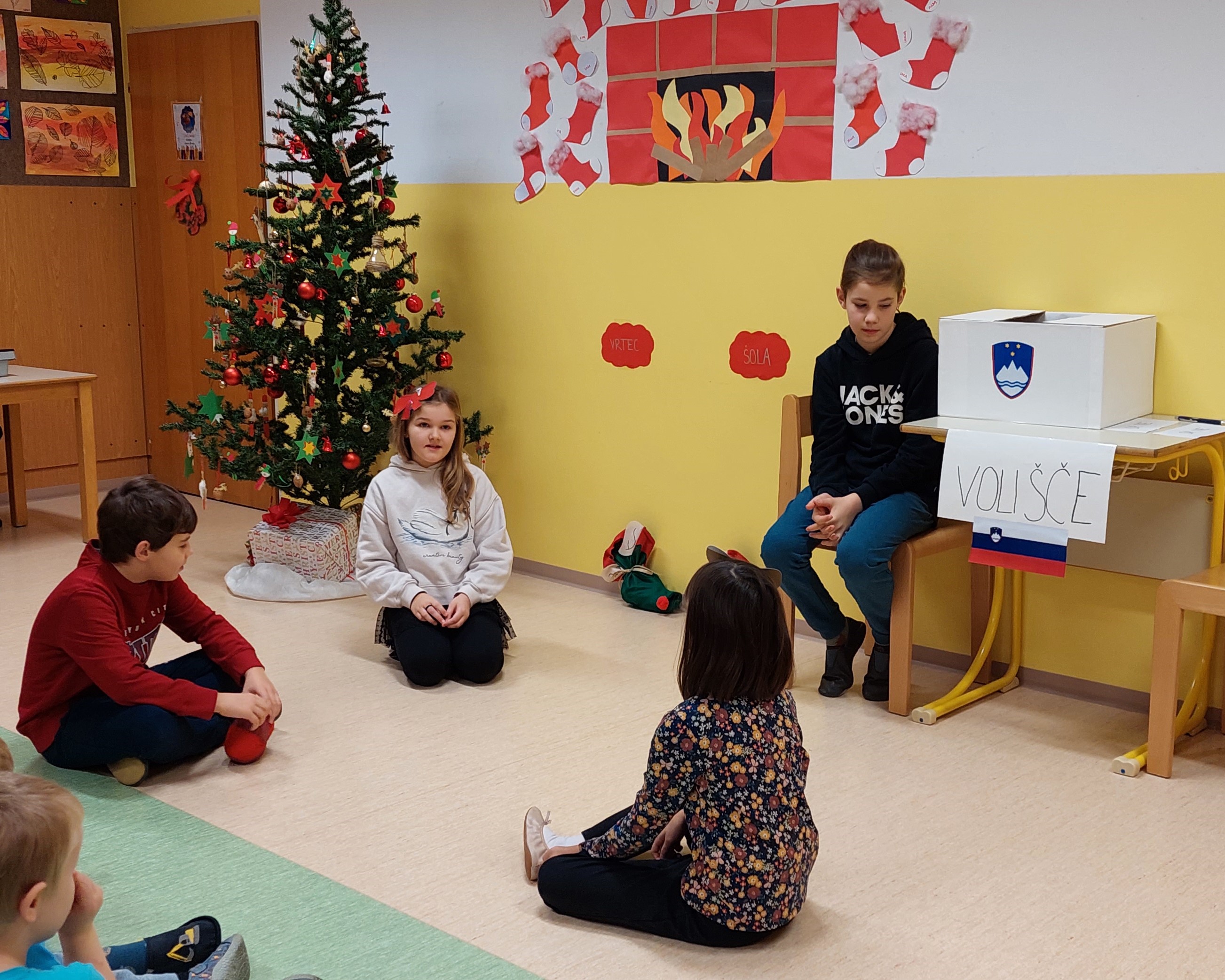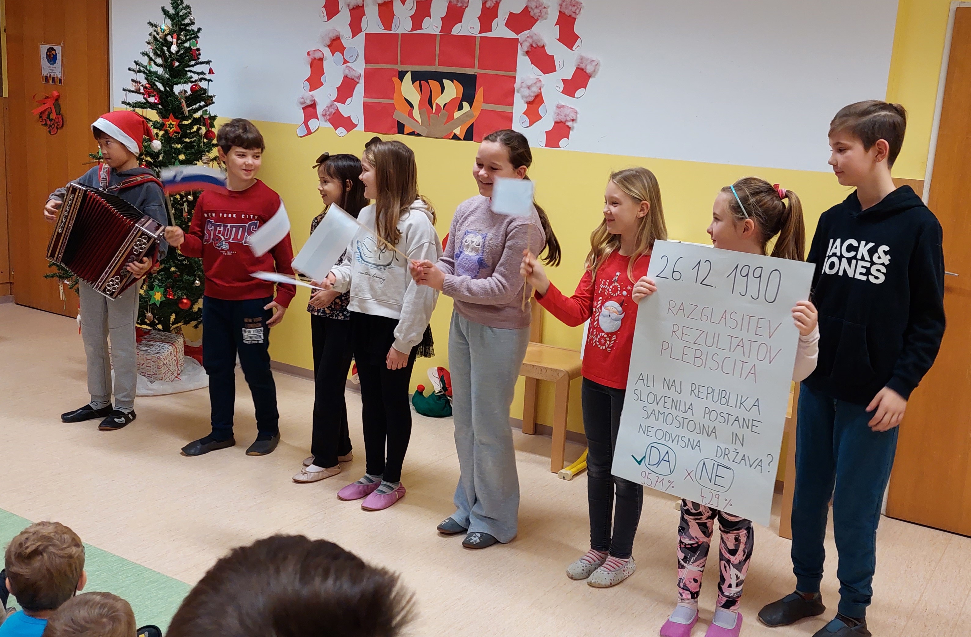 Učenci so zavrteli čas nazaj v nastanek samostojne Slovenije, saj so nazorno prikazali volitve z glasovanjem, štetjem volilnih lističev ter svečano razglasitev rezultatov, ki jo je potrdil tudi glas harmonike. V nadaljevalnem programu ni manjkalo deklamacij, petja, igranja na instrumente, plesa, dramske igrice, seveda je bilo prav v vsaki točki čutiti pridih božično-novoletnega časa.