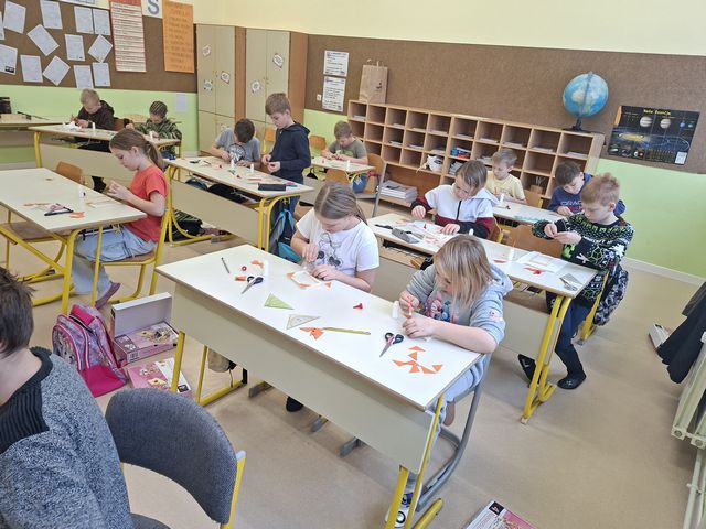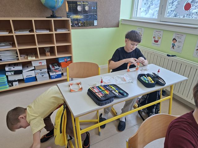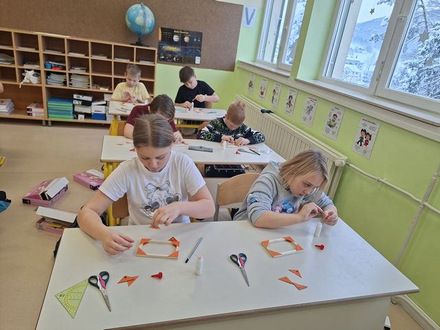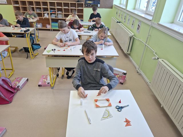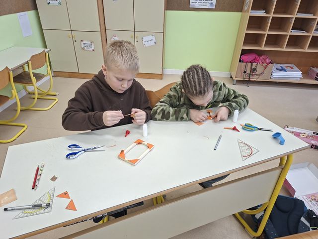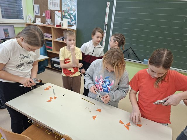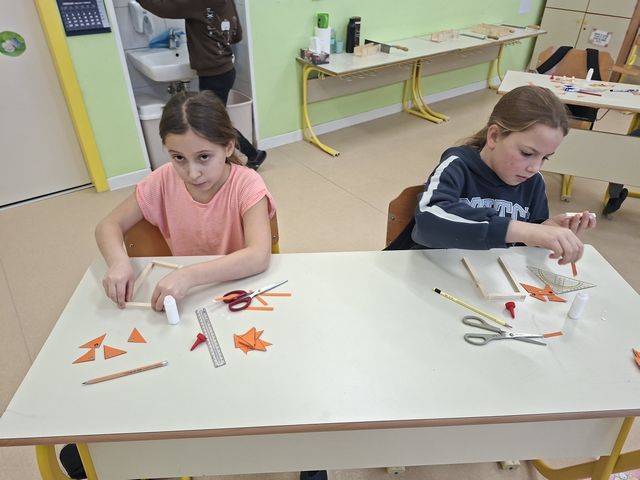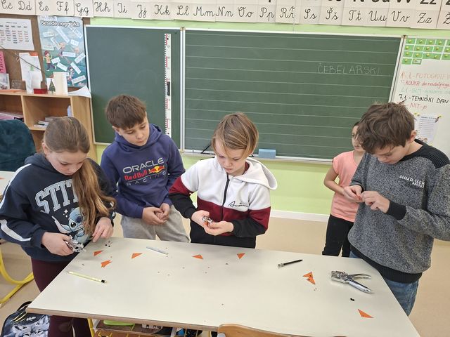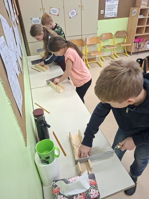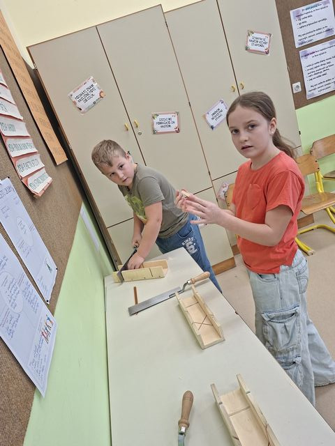 Med delom so učenci spoznavali različna orodja in tehnike. Hitro so ugotovili, da je lepenko z otroškimi škarjami precej težje rezati kot papir. Preizkusili so klešče za luknjanje in kovičenje, s katerimi so najprej naredili luknje, nato pa jih zakovičili. Z ročno žago so morali odžagati letvico –  nekaterim je to šlo kot po maslu, drugi so se morali malo bolj potruditi, a obupal ni nihče. Letvice, ki so jih skrajšali, so nato še pobrusili z brusnim papirjem, da so bile gladke in primerne za lepljenje.