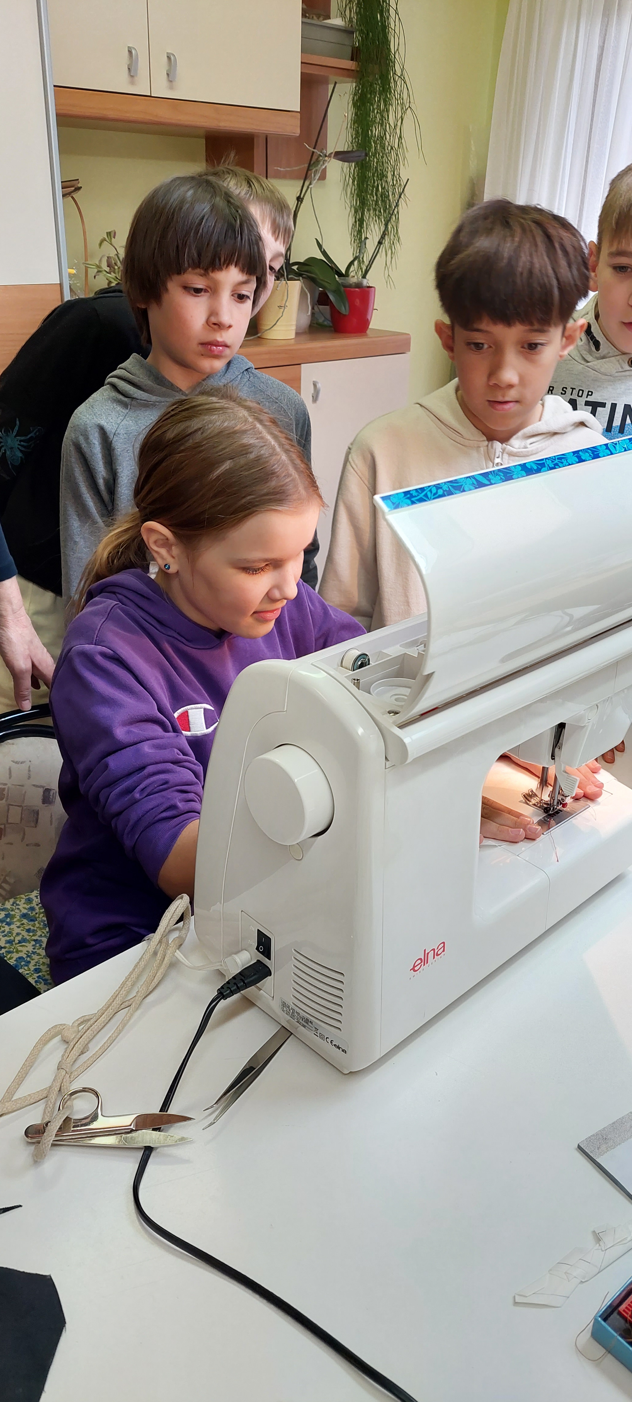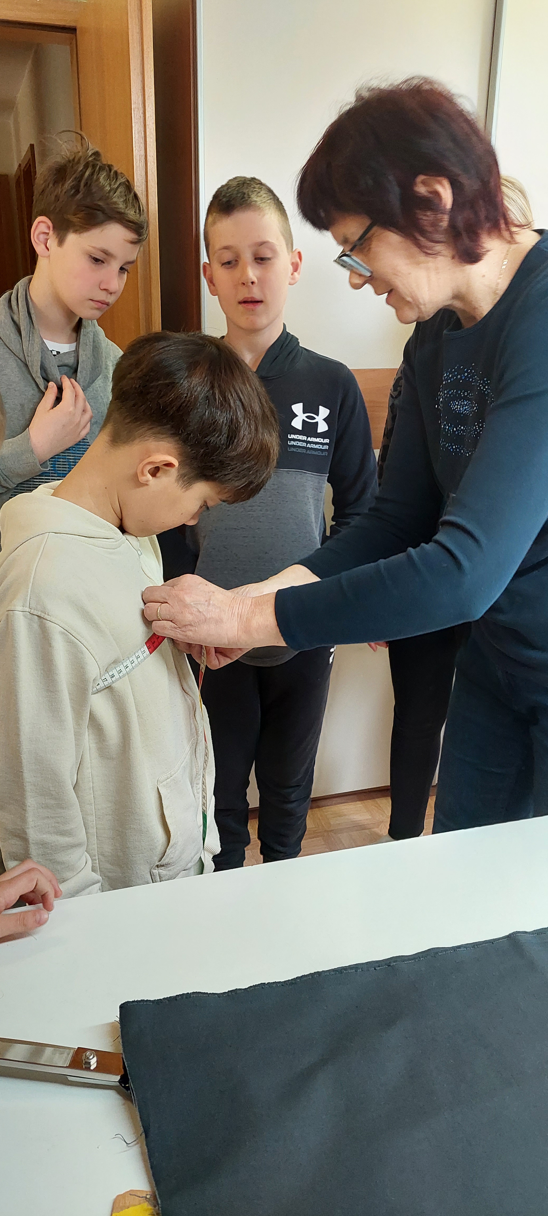 Najprej nam je pokazala različne šivalne stroje in druge pripomočke, ki jih uporablja pri delu. Nato nam je razložila, kako nastanejo hlače. Pripravili smo blago in nanj položili kroj ter ga obrisali s kredo. Vsi smo poskusili rezati tudi s škarjami, ki režejo samo blago. Ugotovili smo, da je to precej težje kot izgleda. Želeli smo narediti različne vzorce s šivalnim strojem. Nekaj nam jih je uspelo naredili, nato pa nas šivalni stroj ni hotel več ubogati. Nitke so se zapletle in šivanja je bilo konec. A šivilja Vida ga bo že popravila! Na koncu je žep na drugem šivalnem stroju sešila še gospa Vida. Bil nam je tako všeč, da smo ga vzeli kar s seboj v šolo.