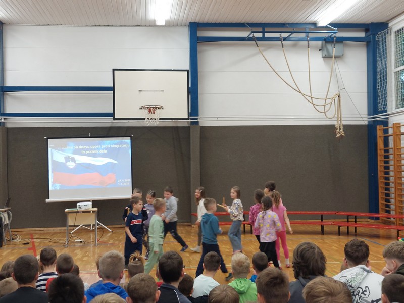 V petek, 25. 4. 2025, smo obeležili dva zelo pomembna prihajajoča praznika – dan upora proti okupatorju in praznik dela. Na proslavi so se zvrstile raznolike točke, ki so jih pripravili učenci in učitelji naše šole. Kulturni program je bil obarvan s pesmijo, plesom, dramskim prizorom (skečem), recitacijo in krajšim filmčkom.